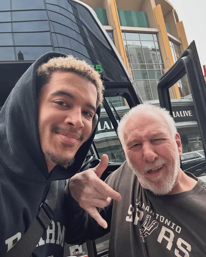 视频中,波波维奇来到训练馆中,与杰里米-索汉沟通,并观看文班亚马练习三分。
