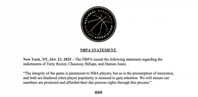 随后NBA球员工会发表声明:“比赛公正性对NBA球员至关重要,但无罪推定原则同样不容践踏。当球员声望被滥用以博取关注时,这两大基石都将遭到破坏。我们将确保会员在此过程中获得应有保护,并享有正当程序权利。”