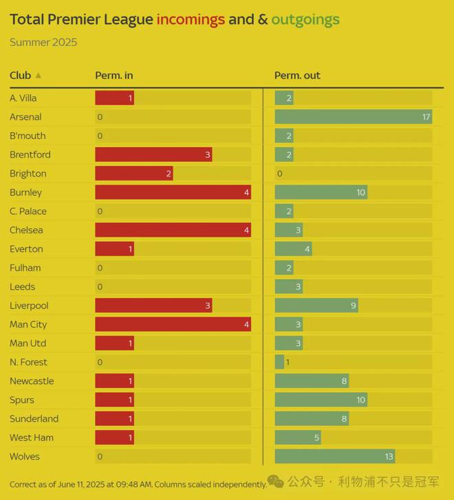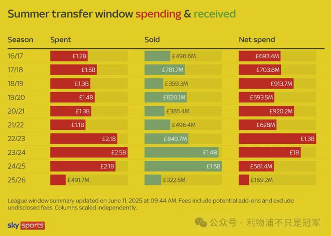 天空体育统计了一组“迷你夏窗”英超球队的转会数据,统计截止到当地时间6月11日上午9点44分,转会费已经将潜在的附加条款计算在内、未披露的转会费未计算(比如曼城签下的门将贝蒂内利(Marcus Bettinelli))。